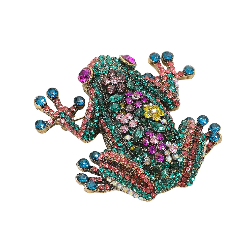 Details • Size : 2.75" X 2.5" • Pin Brooch • Add playful elegance to your style with this sparkling frog brooch, adorned with shimmering crystals for a dazzling finish. Perfect as a statement accessory or a thoughtful gift, this eye-catching pin brings charm, personality, and a touch of sparkle to any outfit. • Lead and Nickel Compliant