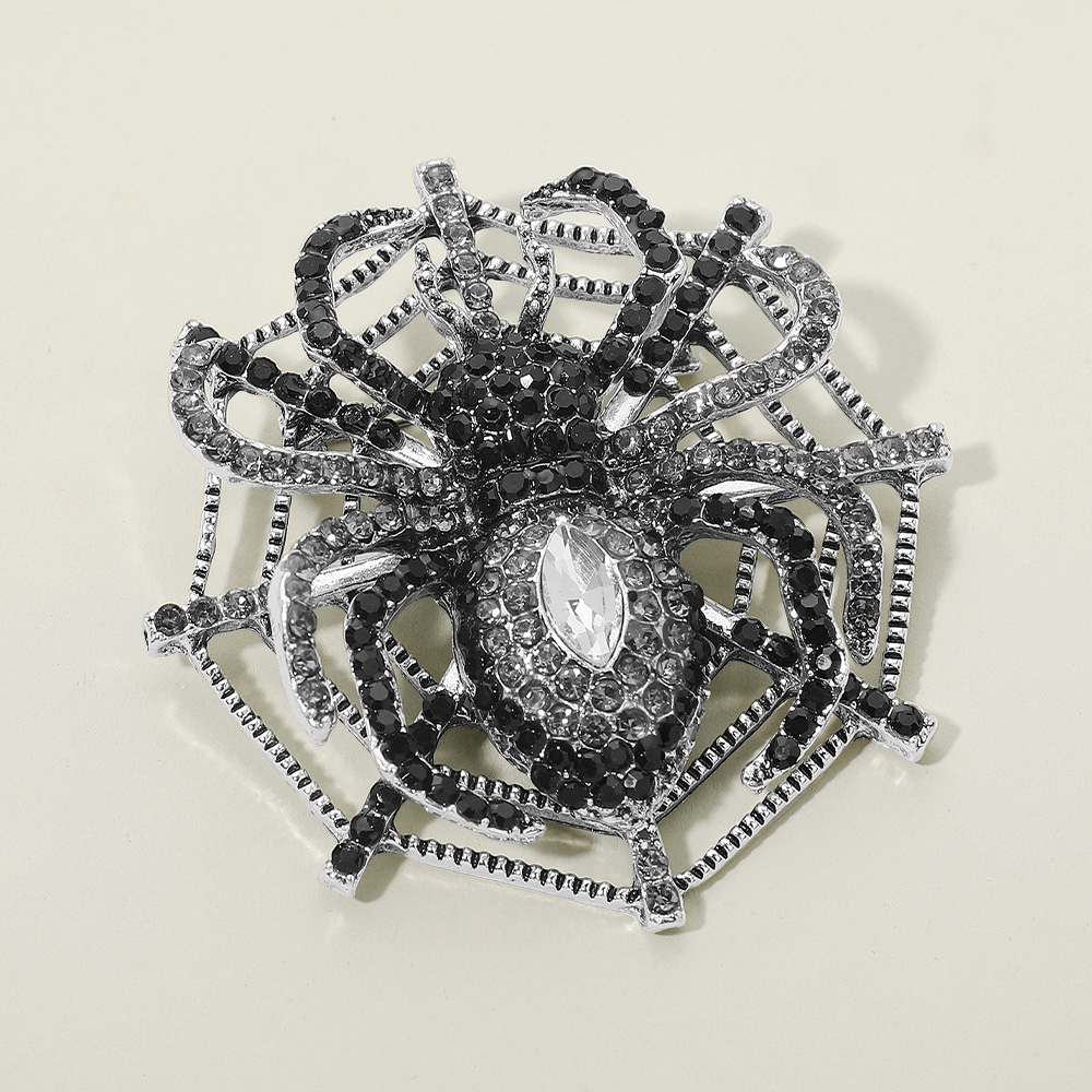 • Dramatic spider brooch with rhinestone detailing and web-shaped design. A sparkling statement accessory perfect for gothic fashion, themed events, or adding bold flair to any outfit.