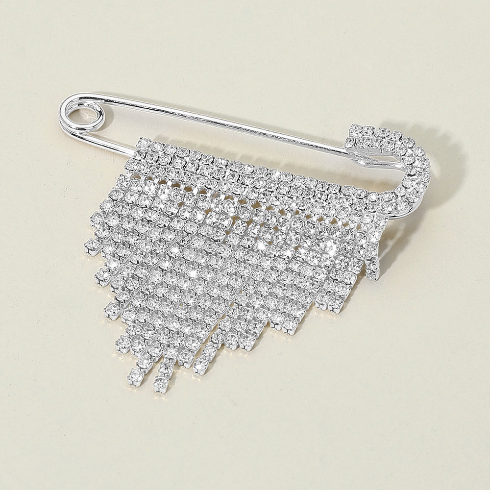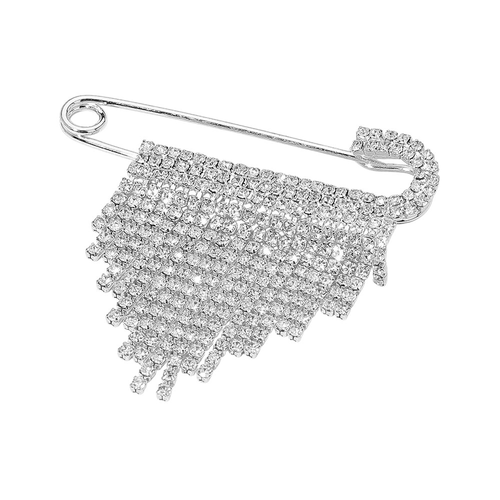 Details • Size : 2.9" X 2.9" • Pin Brooch • Elegant rhinestone safety pin brooch featuring cascading layered fringe design. A chic statement accessory to add sparkle to jackets, scarves, bags, or dresses, perfect for both casual and formal styling. • Lead and Nickel Compliant