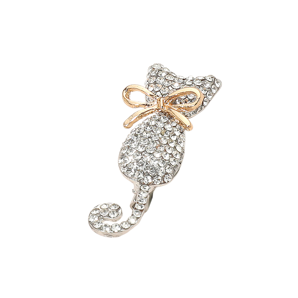 Details • Size : 0.6" X 1.6" • Pin Brooch • Chic cat brooch decorated with shimmering crystals and finished with a delicate bow accent. A playful yet stylish accessory that adds sparkle to jackets, scarves, or bags. Perfect gift choice for animal lovers, collectors, or anyone seeking a touch of whimsical charm in their look. • Lead and Nickel Compliant • Sterling Silver Dipped