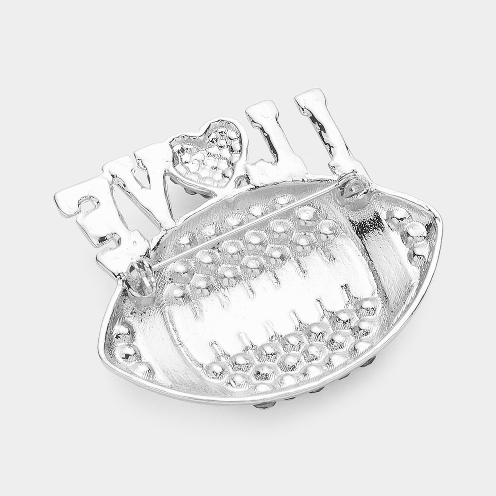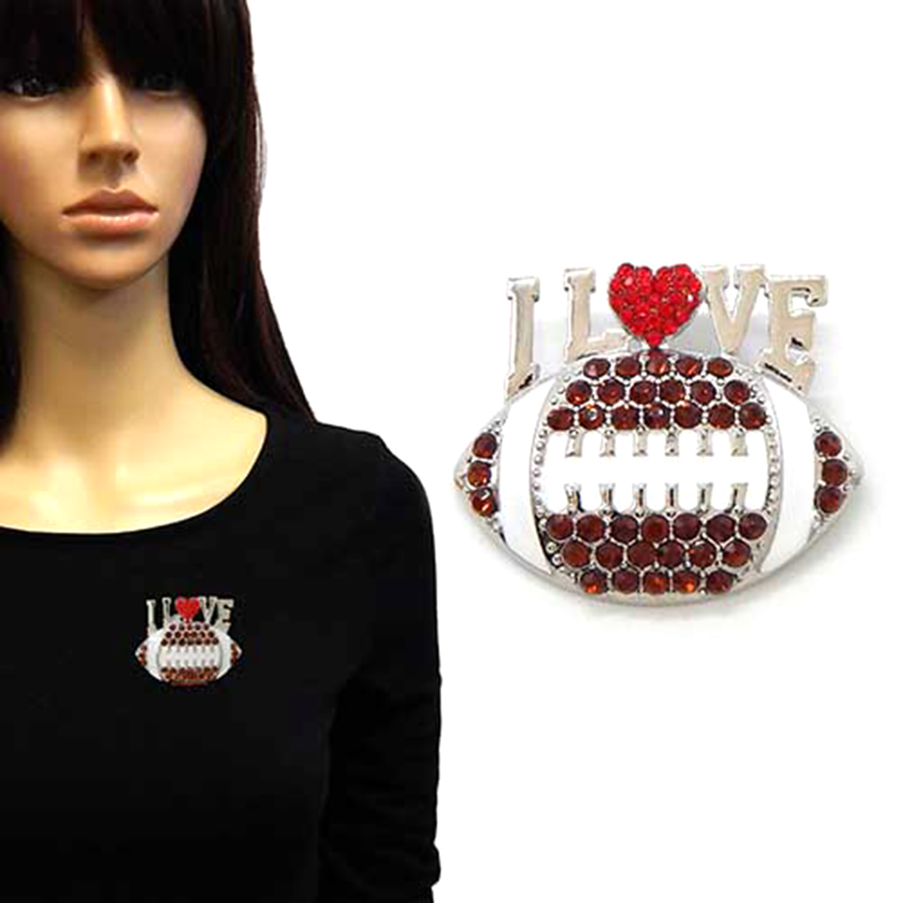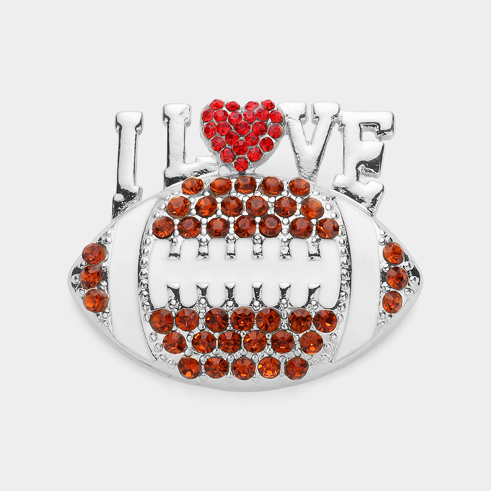 Details • Size : 2.25" X 1.8" • Pin Brooch • Eye-catching football brooch featuring “I Love Football” design with rhinestone accents. Perfect gameday accessory for fans, tailgates, and sports events. Adds sparkle and team spirit to jackets, bags, and hats. • Lead and Nickel Compliant