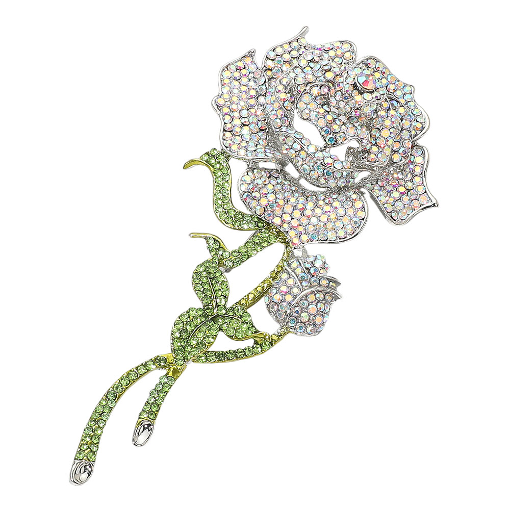 • Chic rhinestone rose brooch featuring a detailed floral silhouette with shimmering stones on the petals, stem, and leaves. Perfect for accessorizing jackets, dresses, scarves, or bags with a refined and eye-catching statement touch.