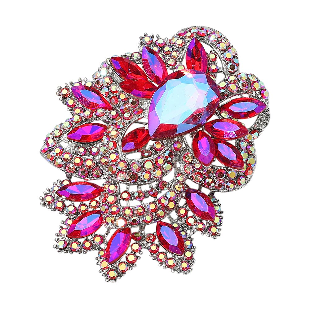 Details • Size : 2.75" X 3.75" • Dual : Brooch / Pendant • Glamorous flower-shaped brooch/pendant with radiant crystals and vibrant gemstone accents, designed to make a bold statement. Perfect for elevating formal outfits, evening gowns, or party attire, this sparkling accessory adds elegance and brilliance, making it an ideal gift or keepsake. • Lead and Nickel Compliant