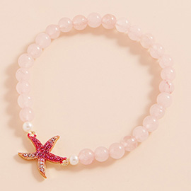 Stainless Steel Stone Paved Tulip Flower Embossed Mother of Pearl Oval Charm Beaded Stretch Bracelet
