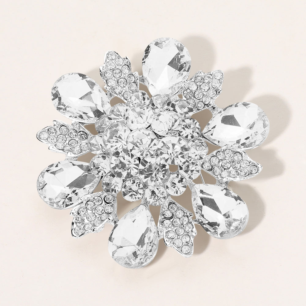 Details • Size : 2.5" x 2.5" • Pin Brooch • This elegant crystal flower brooch adds a radiant touch to any outfit with its beautifully arranged sparkling stones and refined floral silhouette. Perfect for elevating everyday looks or enhancing formal attire, it offers timeless charm and eye-catching brilliance. • Lead and Nickel Compliant
