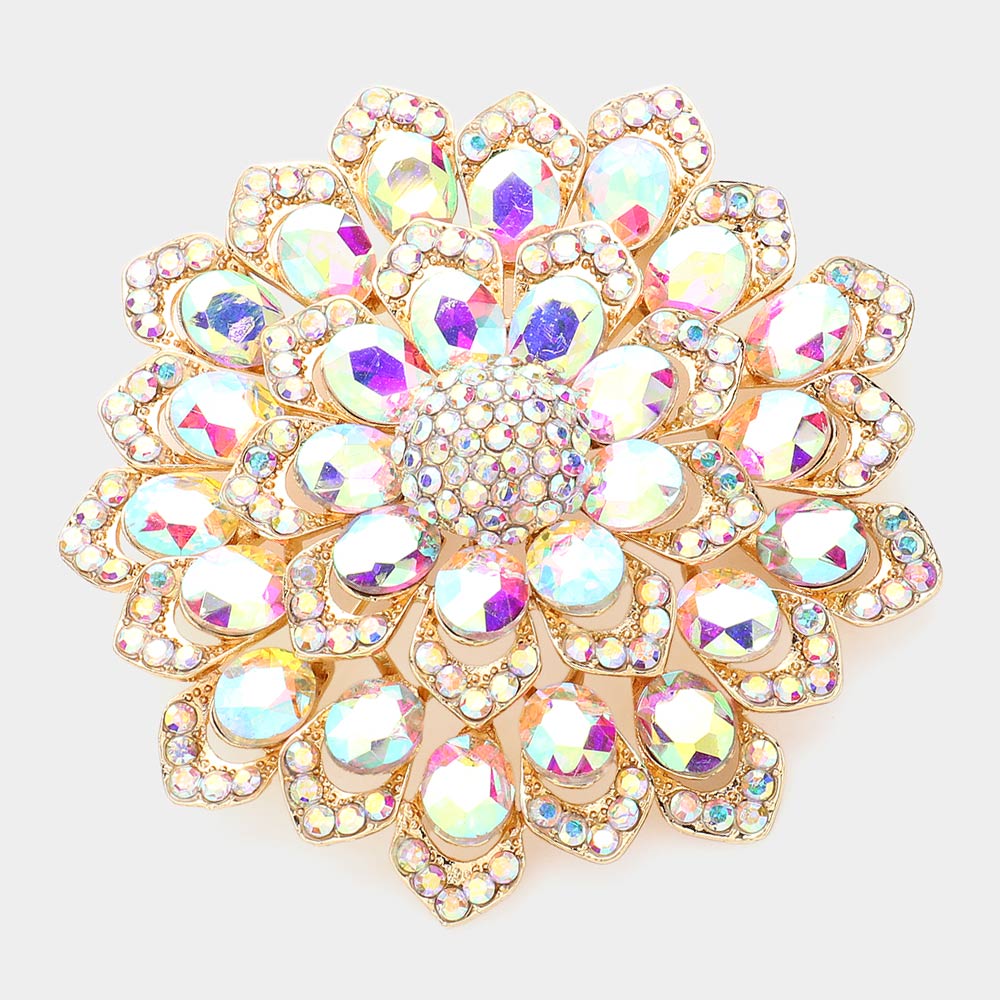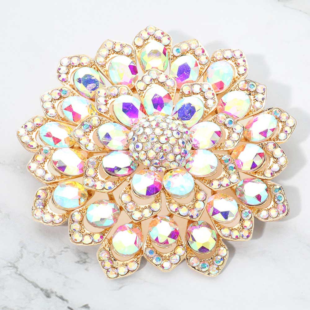 • Stunning floral brooch designed with layered petals and iridescent crystal gemstones. Perfect as a statement accessory for dresses, scarves, shawls, or special occasions, adding sparkle and elegance to any outfit.