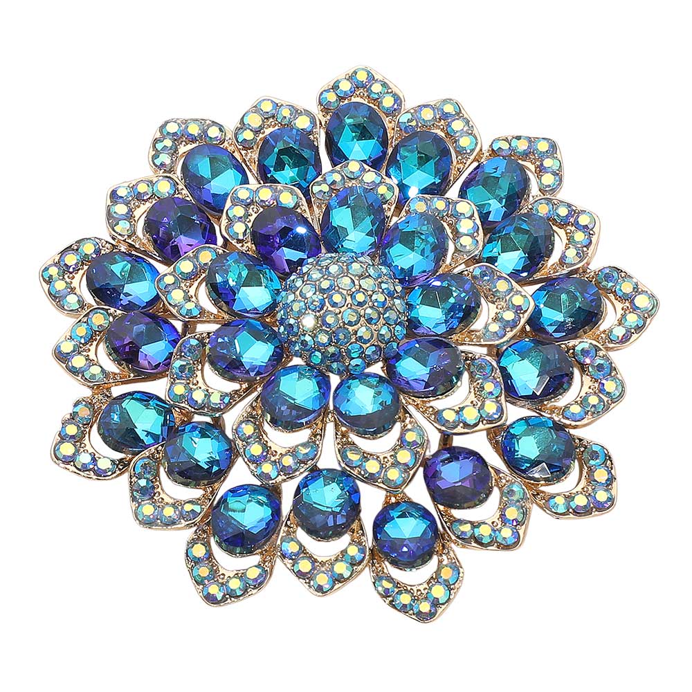 • Stunning floral brooch designed with layered petals and iridescent crystal gemstones. Perfect as a statement accessory for dresses, scarves, shawls, or special occasions, adding sparkle and elegance to any outfit.