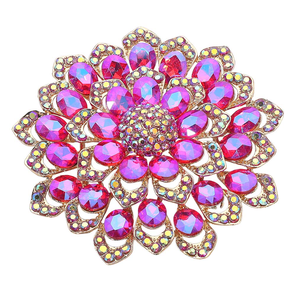 Details • Size : 3.1" X 3.1" • Pin Brooch • Stunning floral brooch designed with layered petals and iridescent crystal gemstones. Perfect as a statement accessory for dresses, scarves, shawls, or special occasions, adding sparkle and elegance to any outfit. • Lead and Nickel Compliant