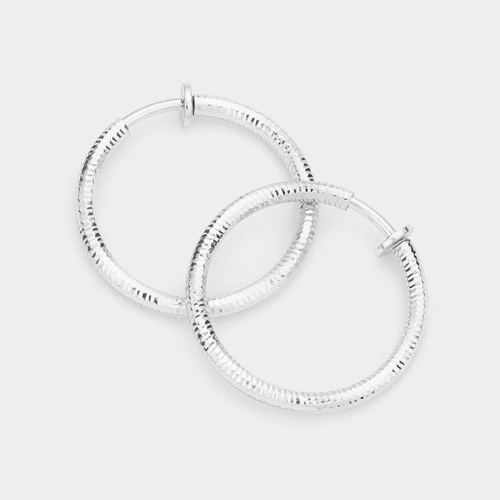 2.4 Inch Textured Metal Clip On Hoop Earrings