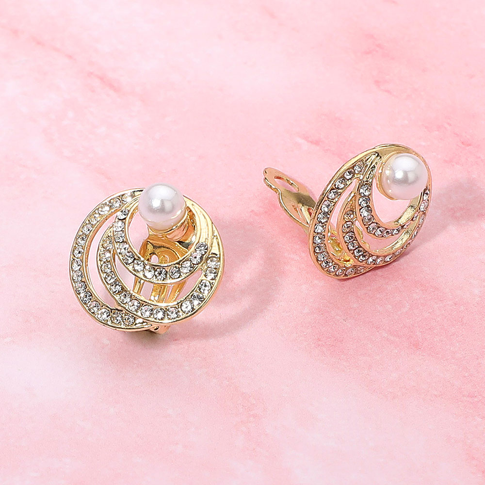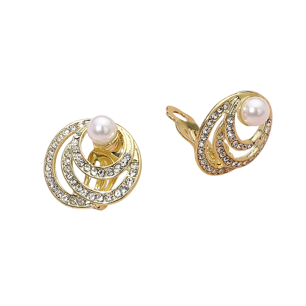 Details • Size : 0.8" X 0.75" • Clip On • Elevate your style with these elegant clip-on earrings featuring a luminous pearl center surrounded by layered crystal-embellished swirls. Designed for comfort and sophistication, they add a refined sparkle to any formal or everyday ensemble without the need for pierced ears. • Lead and Nickel Compliant