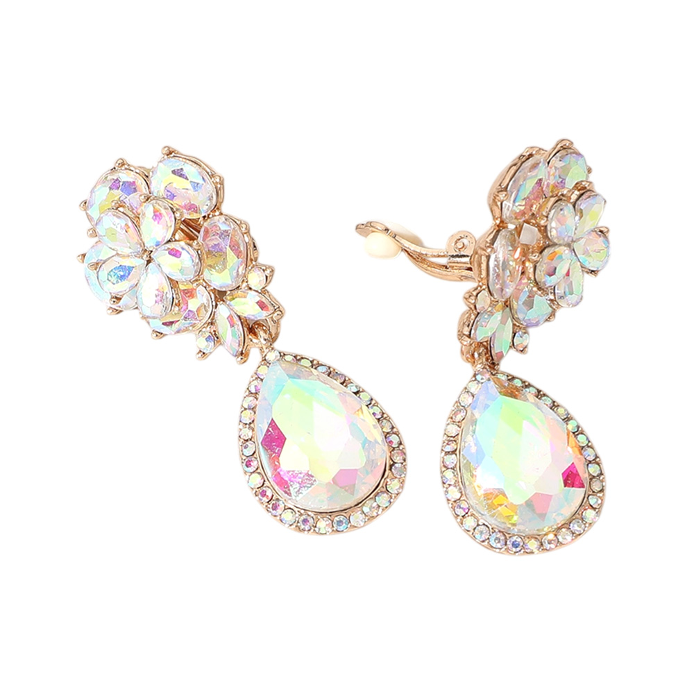 Flower Glass Crystal Teardrop Dangle Clip On Earrings Flower Glass Crystal Teardrop Dangle Clip On Earrings