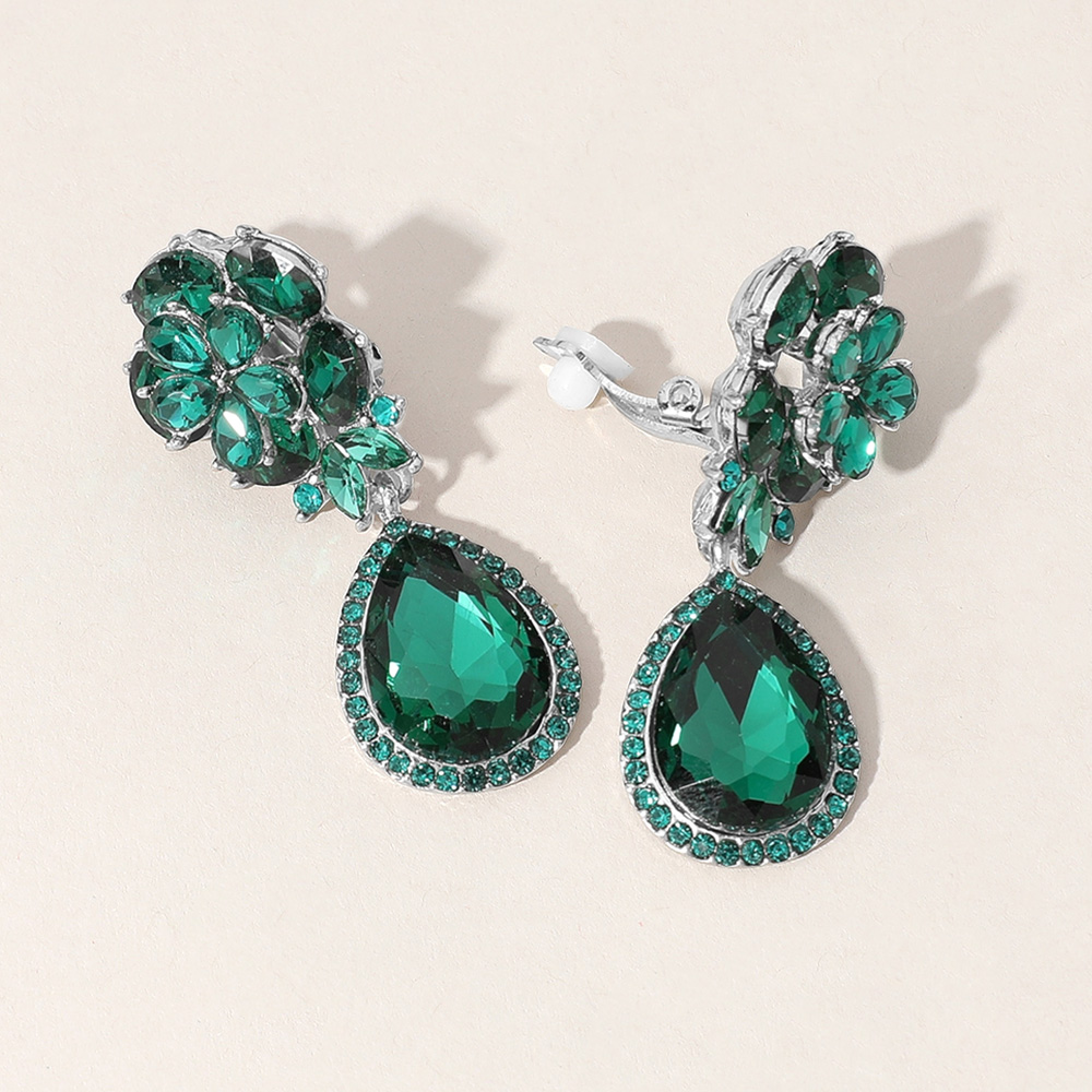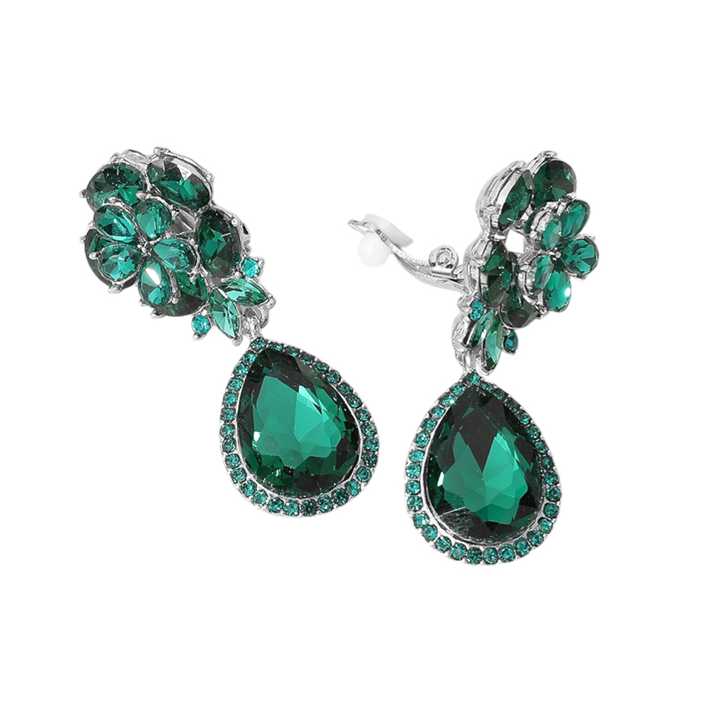 Flower Glass Crystal Teardrop Dangle Clip On Earrings