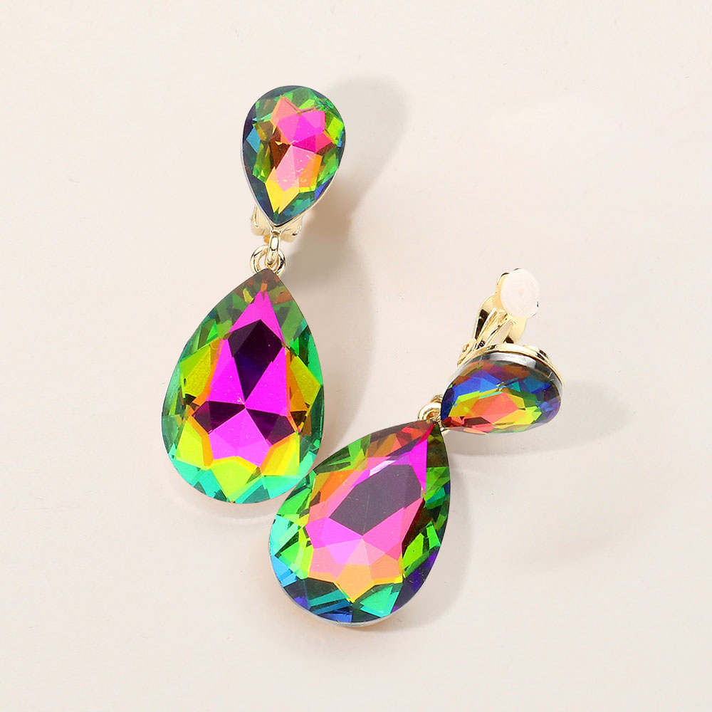Glass Crystal Double Teardrop Clip on Evening Earrings