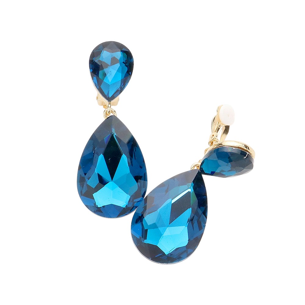 Glass Crystal Double Teardrop Clip on Evening Earrings