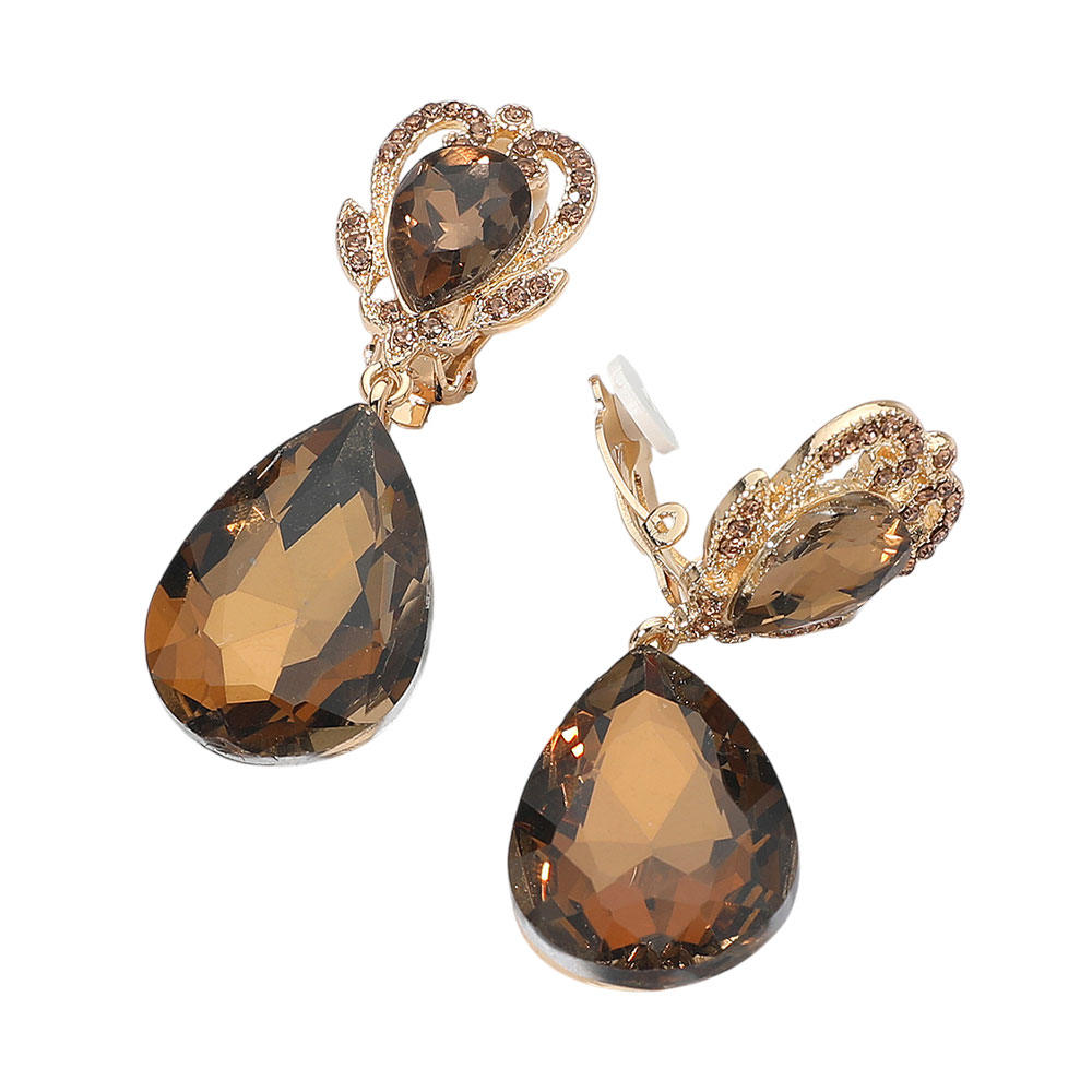 Ornate Top Faceted Teardrop Stone Dangle Clip On Evening Earrings