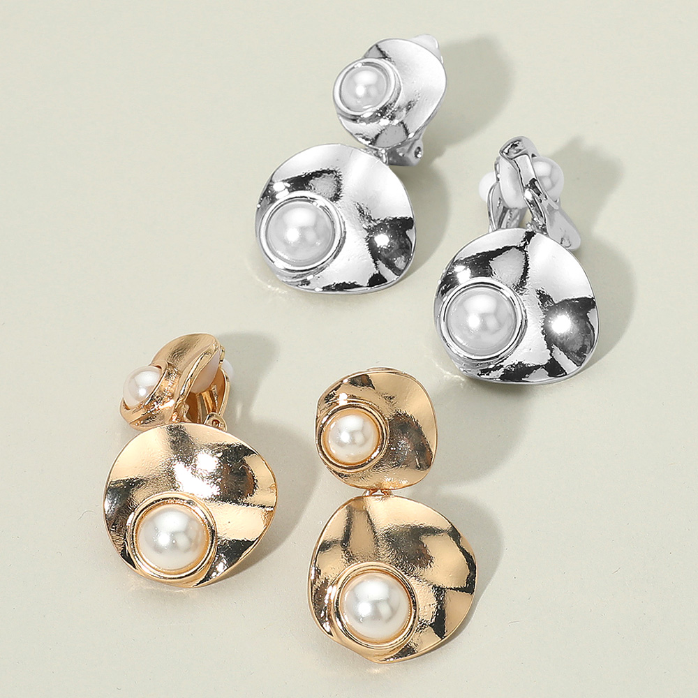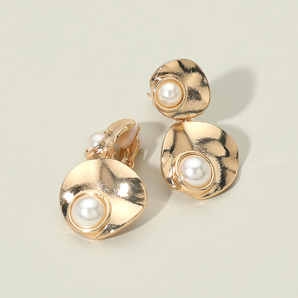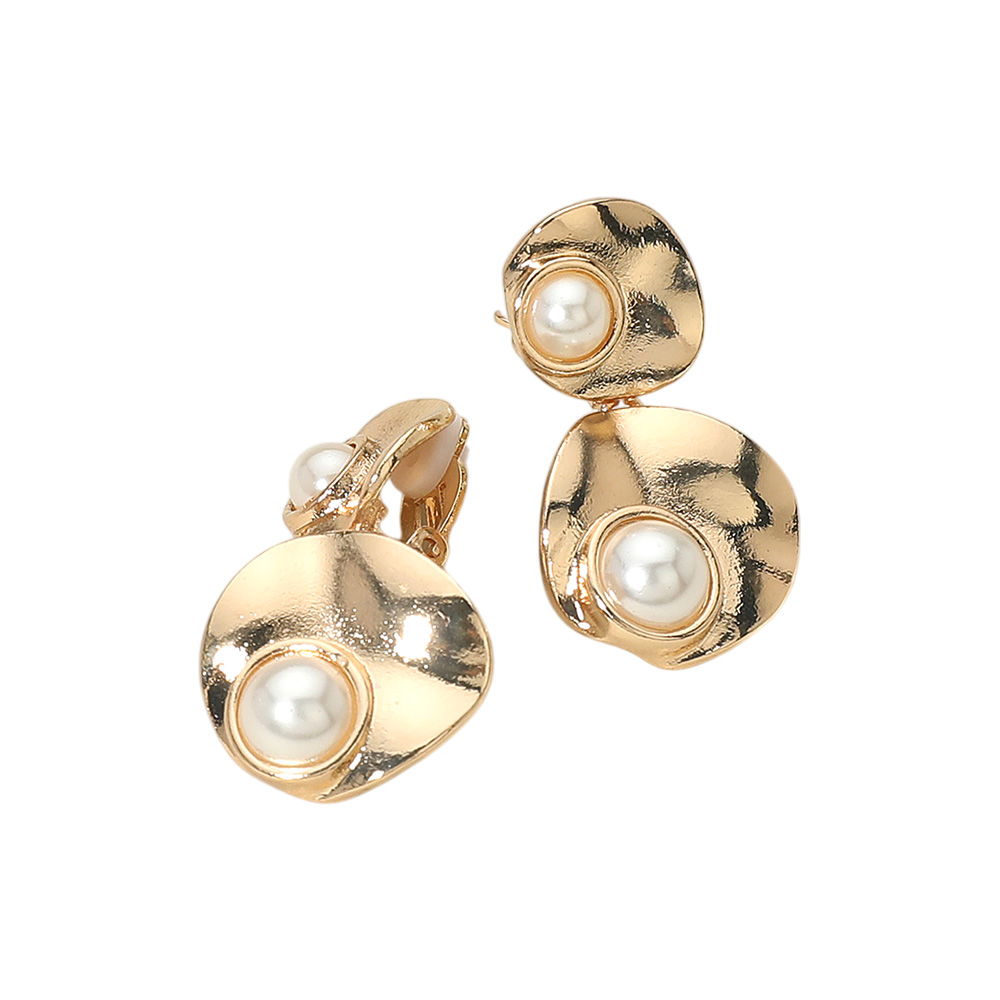 Details • Size : 0.8" X 1.4" • Clip On • Add elegance to your look with these modern clip-on earrings, designed with abstract gold-tone shapes and pearl accents for a refined touch. Comfortable and chic, they are perfect for everyday wear or special occasions, offering effortless style without the need for pierced ears.