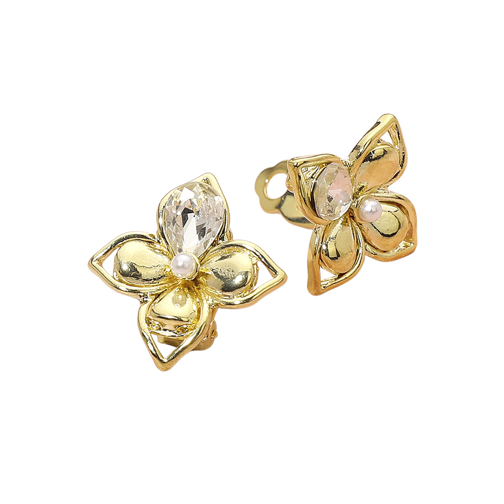 Details • Size : 1" X 1" • Clip On • Add a delicate sparkle to your look with these four-petal clip-on earrings featuring a radiant crystal accent and a luminous pearl centerpiece. Their refined floral design and polished finish make them a timeless, comfortable choice for both casual and elegant occasions. • Lead and Nickel Compliant