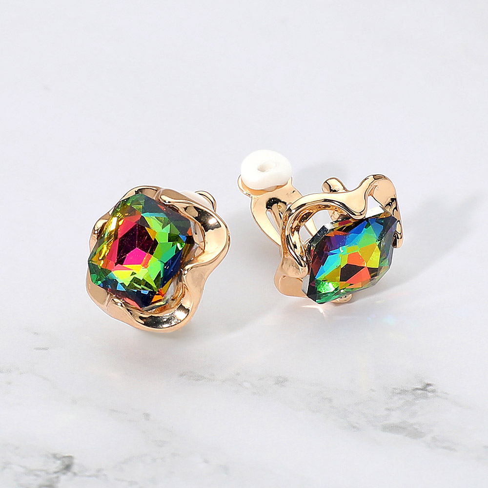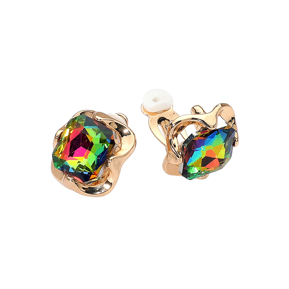 Details • Size : 0.6" X 0.6" • Clip On • Elegant square crystal clip-on earrings featuring a faceted gemstone design framed in a chic sculpted setting. Comfortable clip-on style adds timeless shine to both casual and dressy looks, perfect for effortless everyday elegance. • Lead and Nickel Compliant
