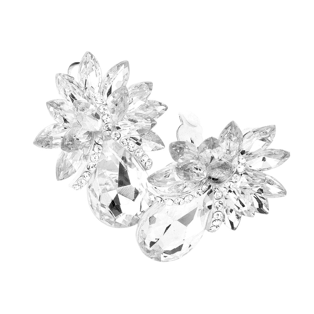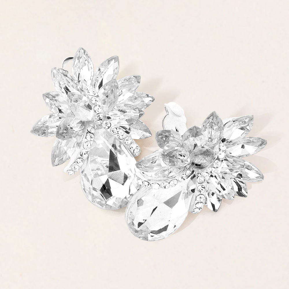 Details • Size : 1.75" X 2.25" • Clip On • Stunning clip-on earrings designed with a leaf cluster arrangement and dazzling crystal accents. These bold statement earrings add a glamorous touch to any outfit, perfect for parties, weddings, and evening events where timeless sophistication meets modern sparkle.