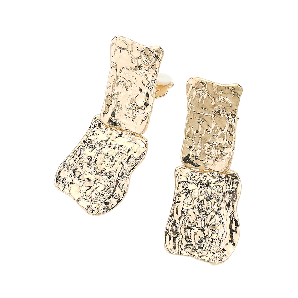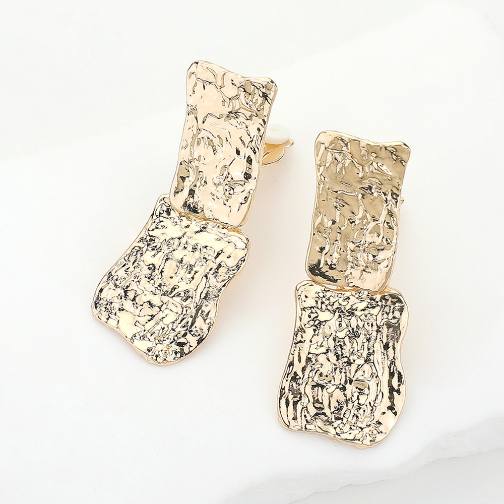 Details • Size : 0.75" X 2" • Clip On • Add a touch of modern edge with these textured rectangle clip-on earrings. Their hammered finish and statement shape make them a standout accessory, offering bold style and comfortable wear without the need for pierced ears. • Lead and Nickel Compliant