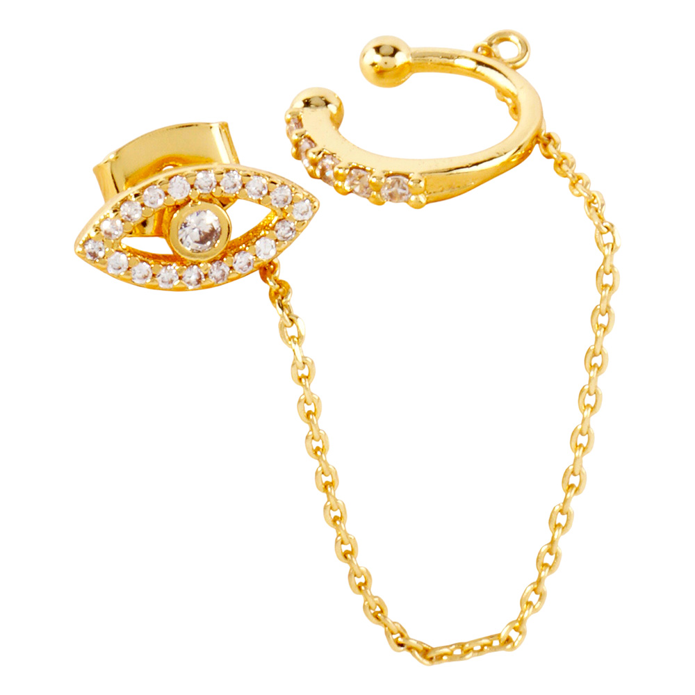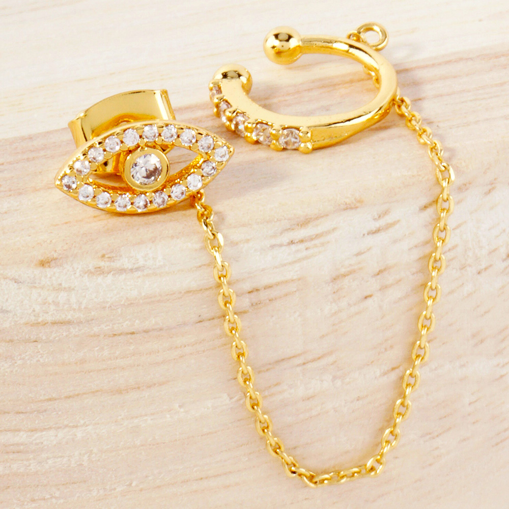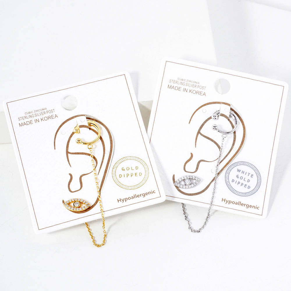 Details • Size : 0.9" X 2.2" • This elegant gold-dipped chain earring features a sparkling evil eye design set with cubic zirconia and paired with a sleek ear cuff. Crafted with hypoallergenic sterling silver posts, it blends modern charm and timeless symbolism, perfect for adding subtle protection and shine. • CZ Cubic Zirconia • Gold Dipped • Hypoallergenic • Lead and Nickel Compliant • Made In Korea • Sterling Silver Post
