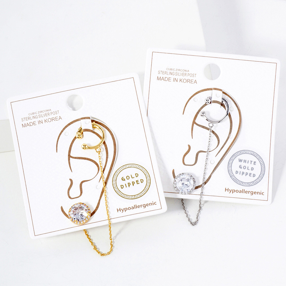 Details • Size : 0.8" X 2.2" • This refined gold-dipped chain earring pairs a dazzling round cubic zirconia stud with a sleek ear cuff, joined by a delicate chain. Designed with hypoallergenic sterling silver posts, it offers a modern yet elegant statement perfect for both casual and evening wear. • CZ Cubic Zirconia • Gold Dipped • Hypoallergenic • Lead and Nickel Compliant • Made In Korea • Sterling Silver Post
