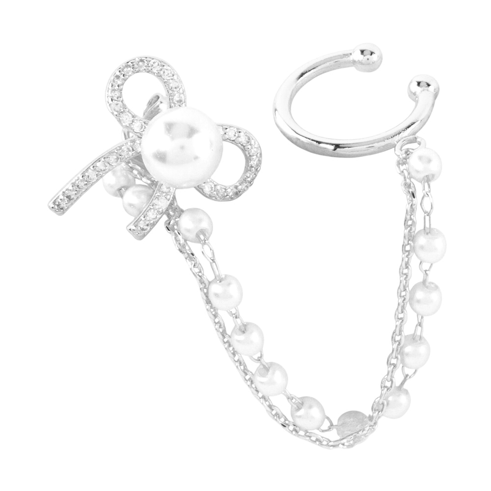 Details • Size : 1" X 2.2" • This white gold-dipped chain earring features a graceful bow adorned with cubic zirconia and a lustrous pearl centerpiece, connected to an elegant ear cuff by dual pearl-accented chains. Designed with hypoallergenic sterling silver posts, it offers a refined and feminine touch for any occasion. • Lead and Nickel Compliant • Hypoallergenic • Made In Korea • Gold Dipped • CZ Cubic Zirconia • Sterling Silver Post