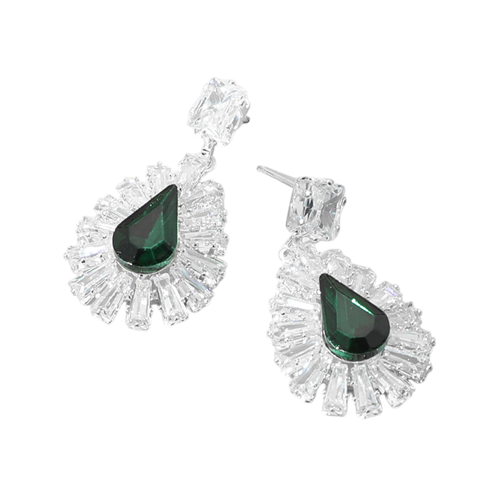 Baguette Stone Rim Teardrop CZ Stone Cluster Dangle Evening Earrings