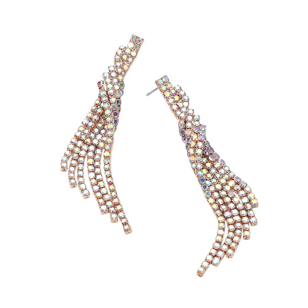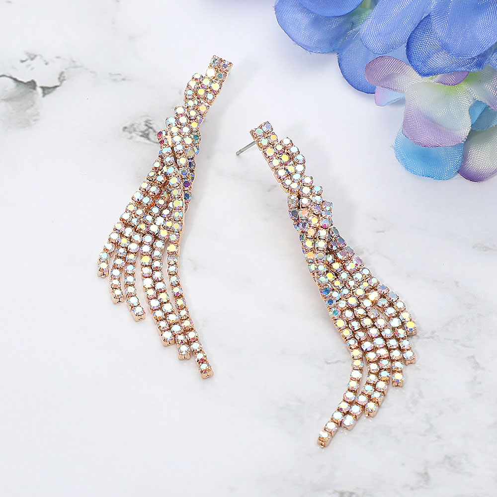 • Stylish dangle earrings featuring cascading cz rhinestone tassels in a layered fringe design. The flowing strands create elegant movement, perfect for evening wear, parties, and adding a touch of glamour to any outfit.