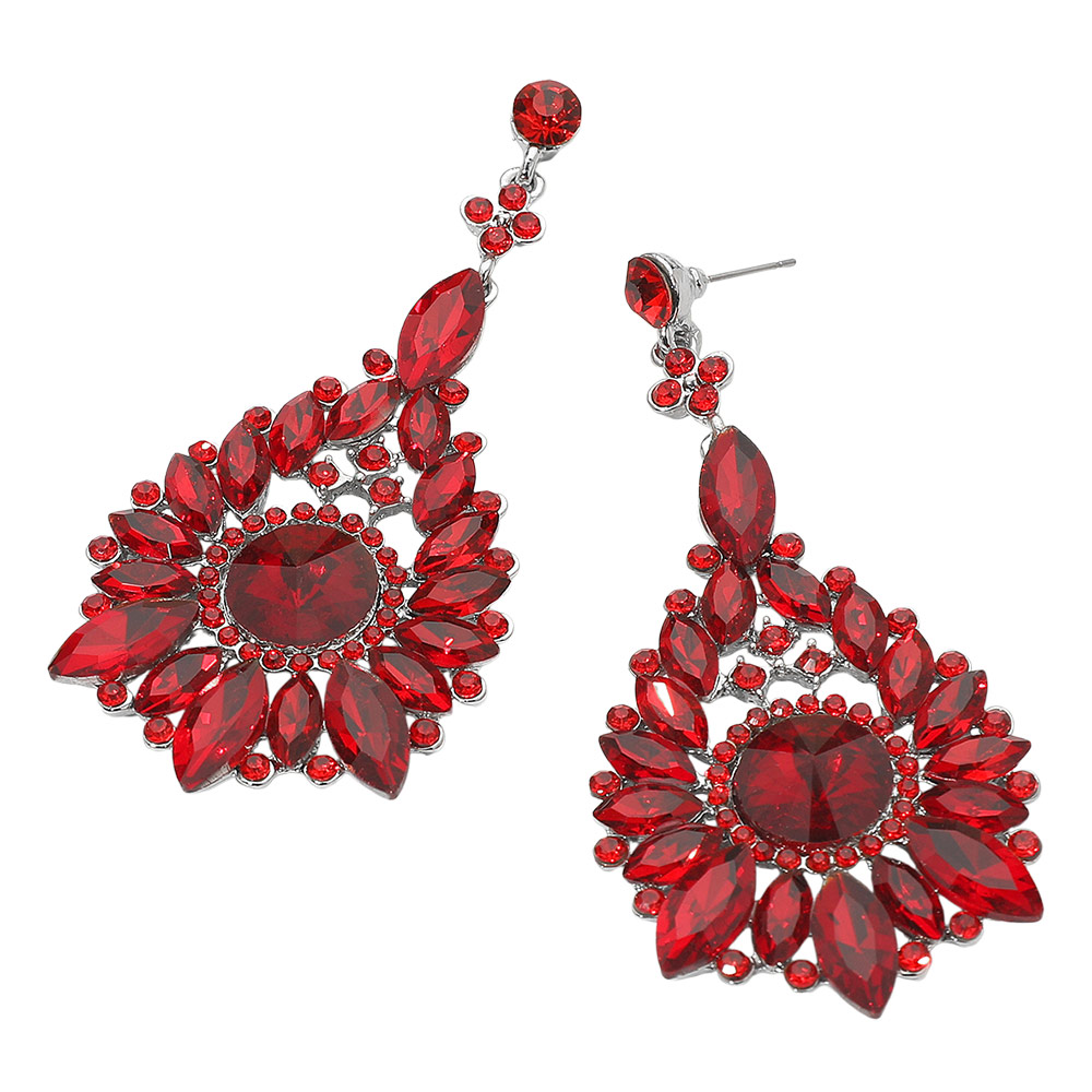 Details • Size : 1.6" X 3.7" • Post Back • Make an unforgettable impression with these statement teardrop crystal earrings. Designed with intricate faceted stones in a radiant arrangement, they capture light beautifully for a luxurious look—perfect for evening events, weddings, and glamorous nights out.