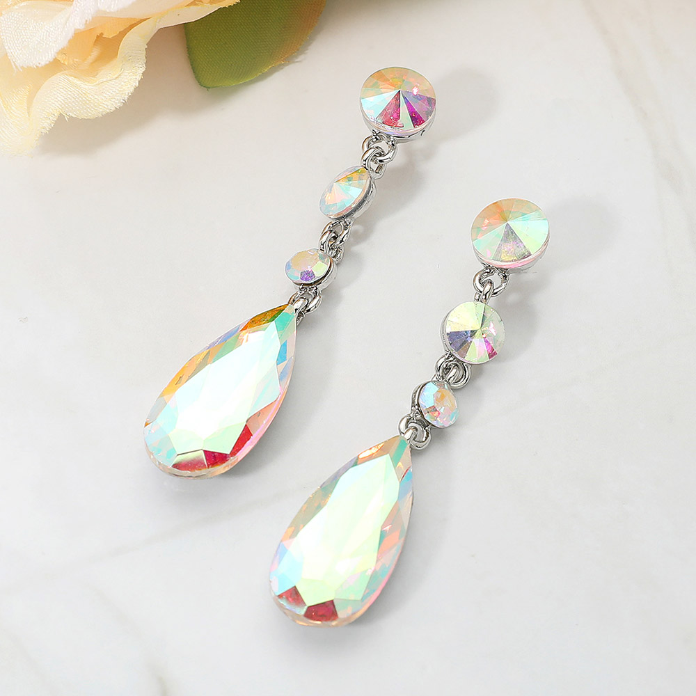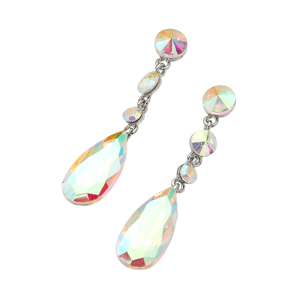 Details • Size : 0.6" X 2.7" • Post Back • Make a glamorous statement with these elegant Multi-Faceted Dangle Earrings. Each earring features a brilliant, large pear-shaped crystal suspended below a line of three smaller, round, sparkling gems. The stones possess a spectacular iridescent shimmer that shifts in the light, displaying a captivating play of different hues. Set in a slim metallic drop design, these earrings offer striking length and sparkle, making them the perfect choice for formal events, weddings, proms, or any occasion requiring a touch of sophisticated glamour. • Lead and Nickel Compliant