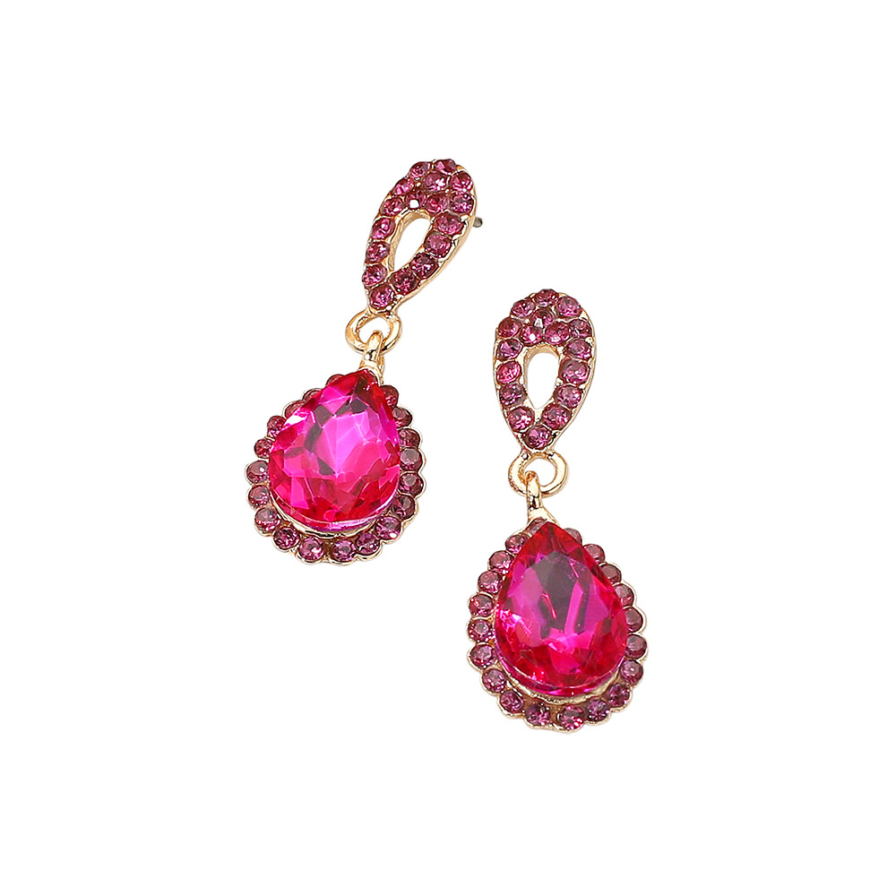 • Make a dazzling entrance with these elegant Teardrop Crystal Dangle Earrings. Each earring features a brilliant, large pear-shaped stone with an iridescent, rainbow-like shimmer, suspended beneath an oval link paved with smaller, sparkling gems. The highly faceted stones catch and reflect light from every angle, creating a spectacular glow. These statement earrings are perfect for bridal jewelry, proms, galas, or any formal event where you want to add exceptional sparkle and sophistication.