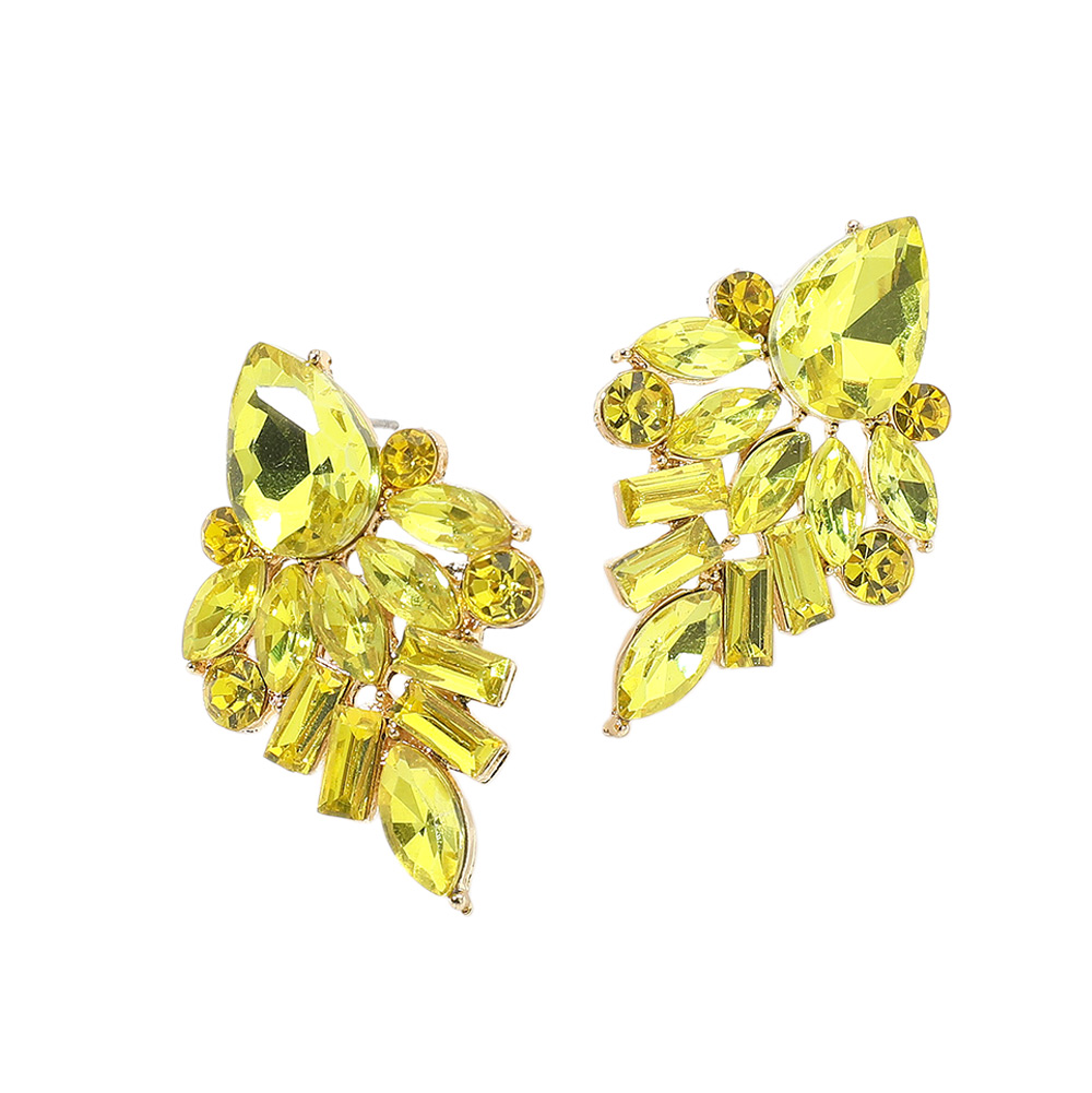 • Shine brilliantly with these radiant cluster stud earrings, designed with an array of faceted crystals in teardrop, oval, and baguette cuts. Their intricate arrangement adds a touch of glamour, making them the perfect accessory for special occasions or elevating your everyday chic look.