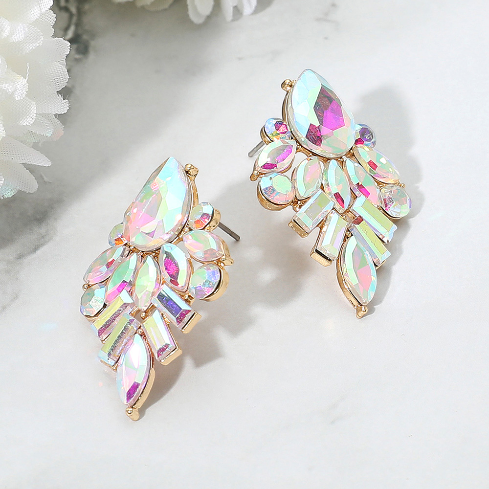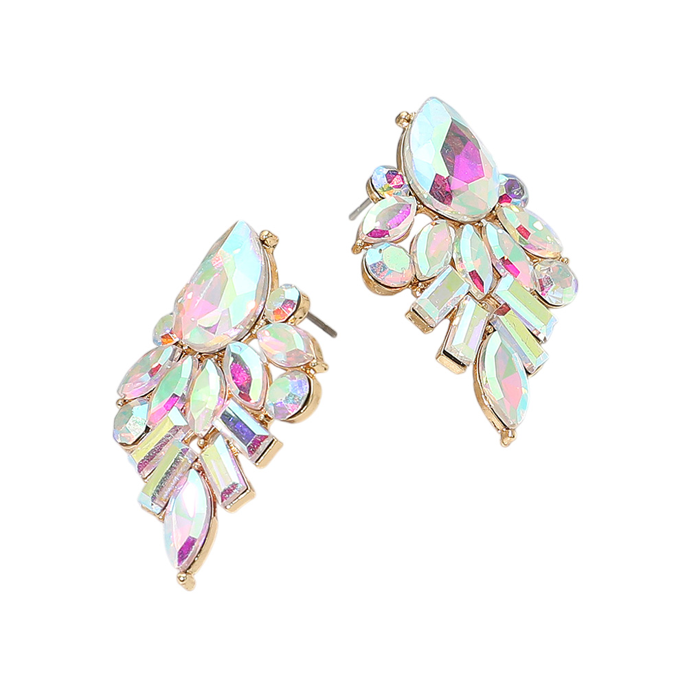 • Shine brilliantly with these radiant cluster stud earrings, designed with an array of faceted crystals in teardrop, oval, and baguette cuts. Their intricate arrangement adds a touch of glamour, making them the perfect accessory for special occasions or elevating your everyday chic look.