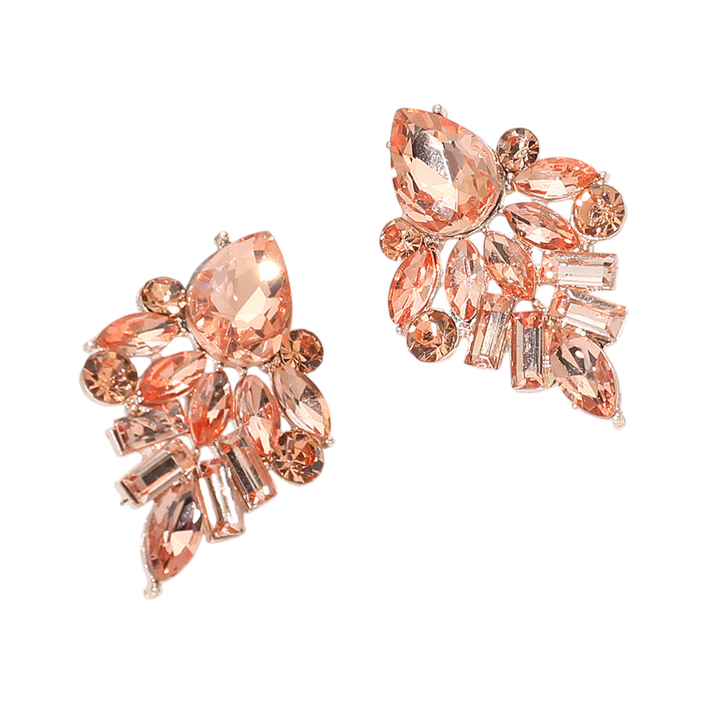 Details • Size : 1" X 1.4" • Post Back • Shine brilliantly with these radiant cluster stud earrings, designed with an array of faceted crystals in teardrop, oval, and baguette cuts. Their intricate arrangement adds a touch of glamour, making them the perfect accessory for special occasions or elevating your everyday chic look. • Lead and Nickel Compliant