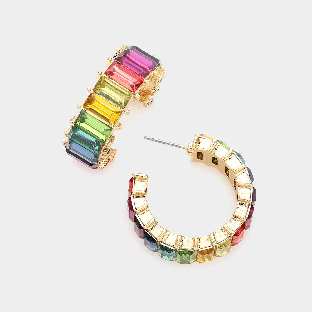Rainbow Baguette Stone Cluster Hoop Evening Earrings