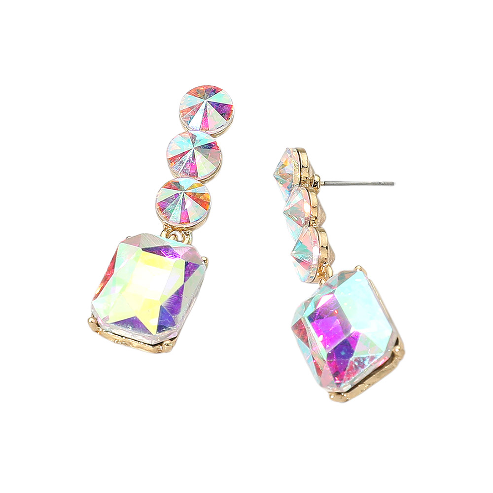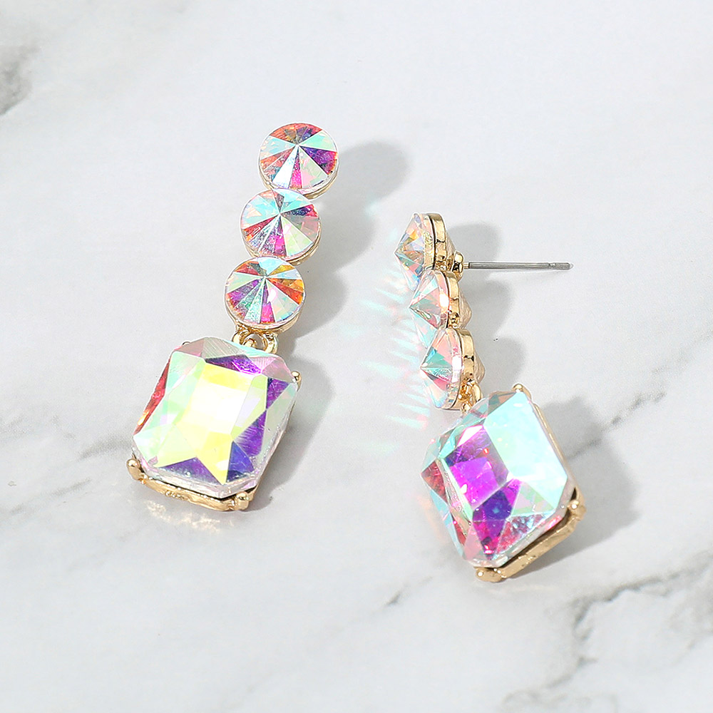Details • Size : 0.5" X 1.9" • Post Back • These geometric crystal drop earrings feature round and rectangular faceted stones in a sleek cascading design. Perfect for adding modern elegance to evening wear, parties, or special occasions, they combine bold sparkle with sophisticated style. • Lead and Nickel Compliant