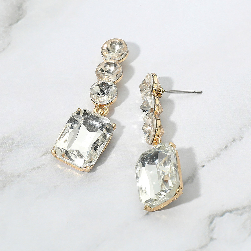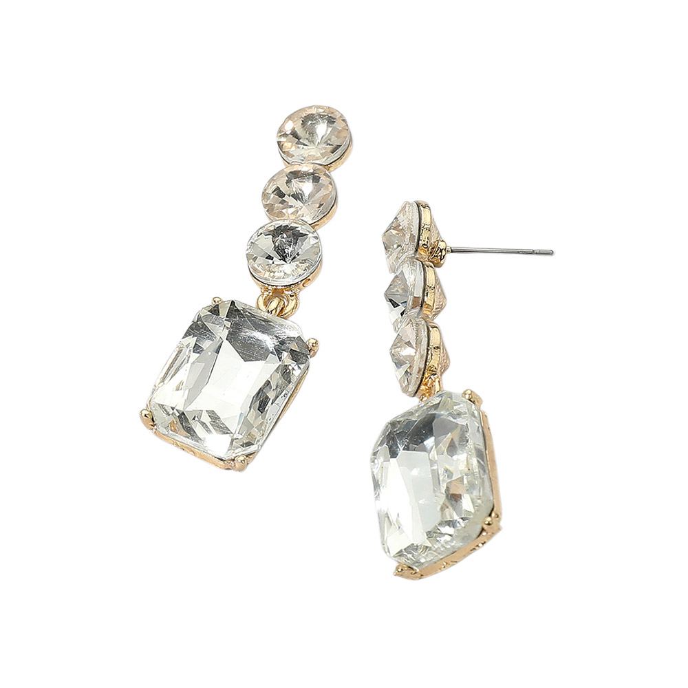 • These geometric crystal drop earrings feature round and rectangular faceted stones in a sleek cascading design. Perfect for adding modern elegance to evening wear, parties, or special occasions, they combine bold sparkle with sophisticated style.