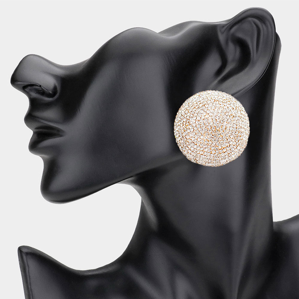 Details • Size : 1.75" X 1.75" • Post Back • These bold round statement earrings shimmer with countless crystals, creating a dazzling and sophisticated look. Perfect for special occasions or evening wear, their striking design captures attention effortlessly, adding a glamorous touch to any outfit with timeless elegance. • Lead and Nickel Compliant