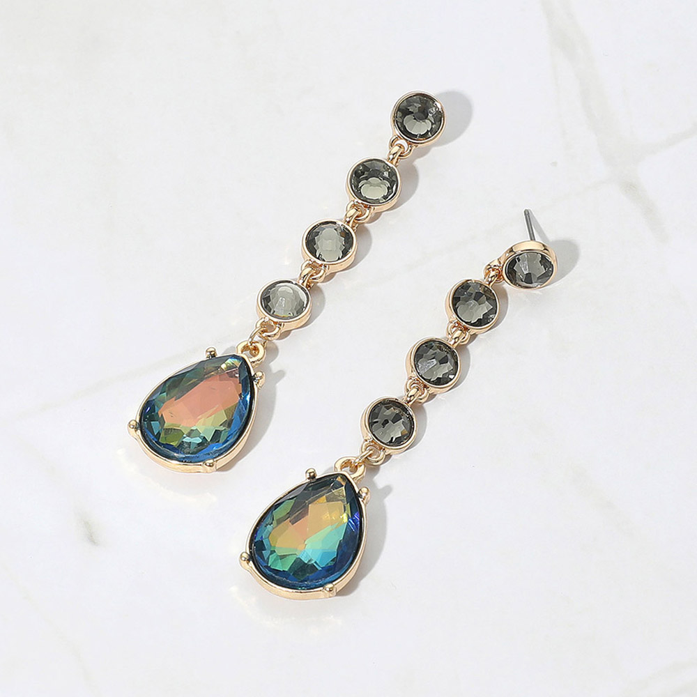 • Make a bold statement with these iridescent teardrop dangle earrings featuring gradient multicolor crystals and round accents in a sleek gold-tone setting. Lightweight and eye-catching, they’re perfect for evening events, parties, or adding a glam touch to your everyday style. A must-have accessory for trendsetters.