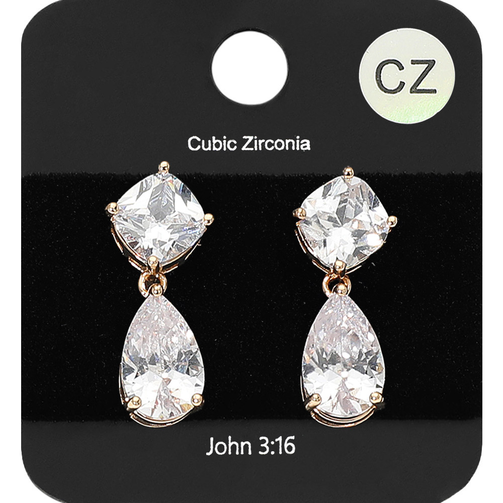 Details • Size : 0.4" X 1" • Post Back • These teardrop cubic zirconia drop earrings showcase dazzling brilliance with a radiant dual-stone design. The shimmering teardrop crystals catch the light beautifully, creating an elegant statement piece perfect for weddings, evening events, or adding sparkle to any outfit. • CZ Cubic Zirconia • Lead and Nickel Compliant