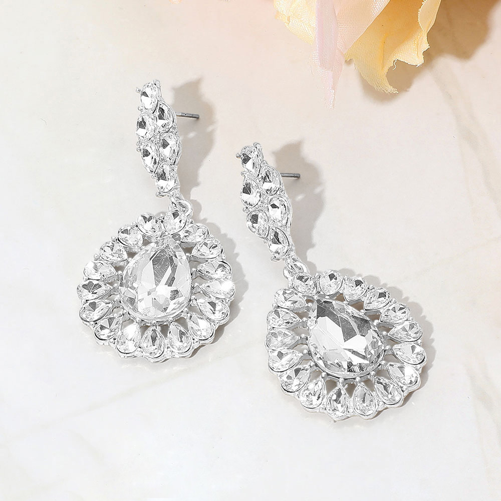 • Shine with elegance in these vintage-inspired teardrop crystal drop earrings. Featuring a radiant halo of faceted stones around a striking center gem, they’re perfect for weddings, galas, or festive events. A timeless statement piece that adds sophistication to any outfit.