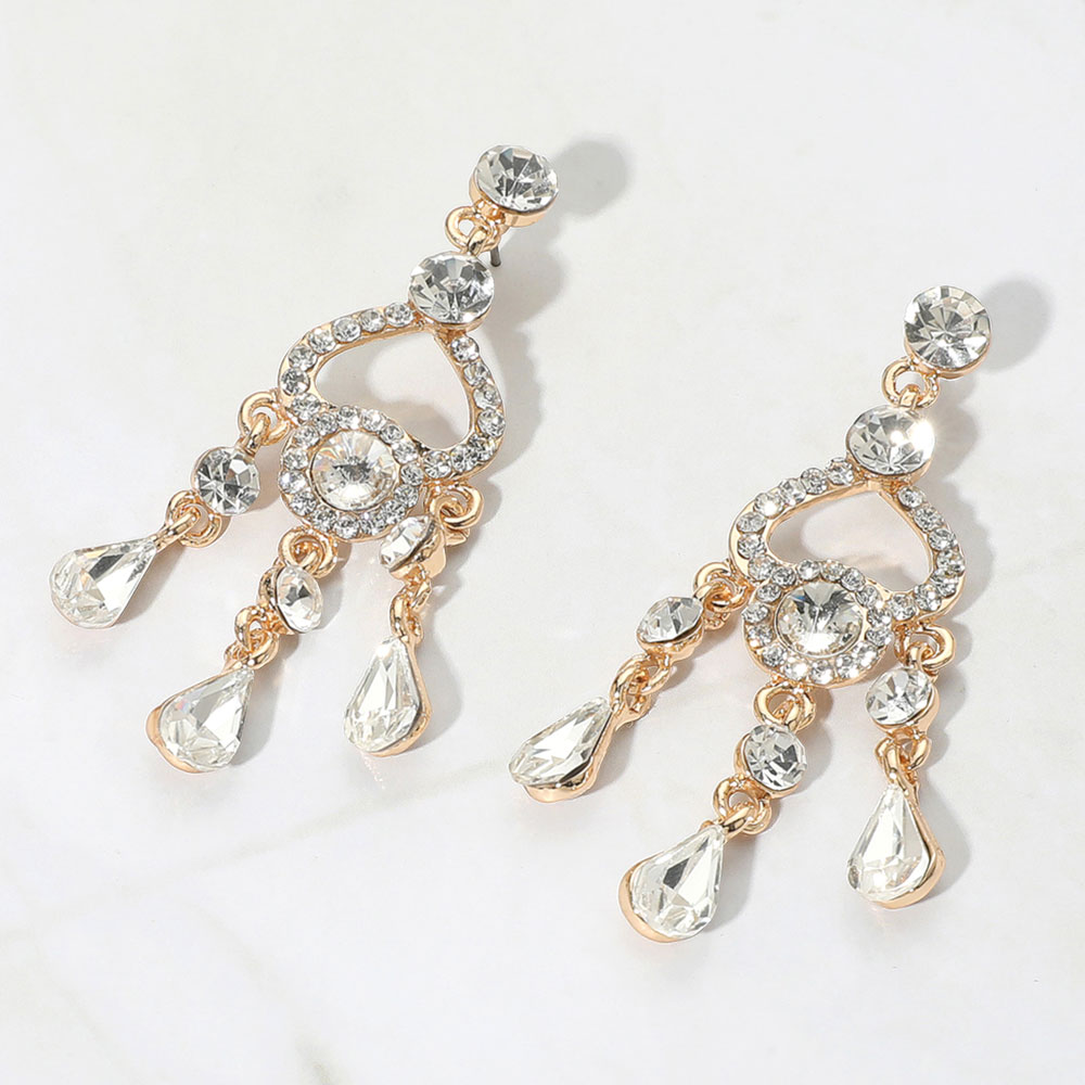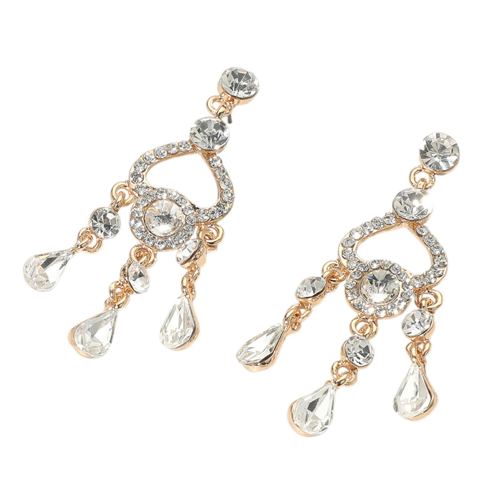 • Add glam to your look with these rhinestone chandelier earrings featuring a heart-shaped frame and teardrop dangles. Designed for sparkle and movement, they’re perfect for weddings, parties, or evening wear. Lightweight with a secure fit for all-night comfort.