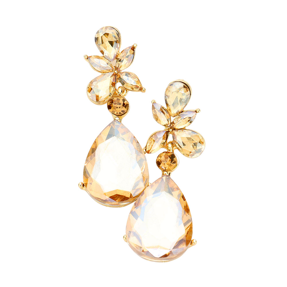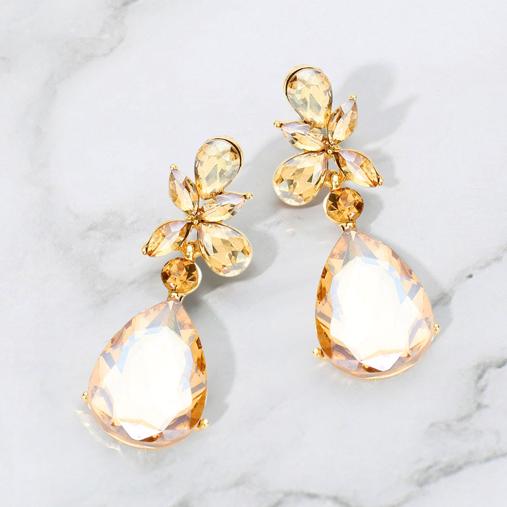 • Make a striking impression with these faceted teardrop statement earrings. Featuring bold, multi-cut stones arranged in a floral-inspired design, they capture light beautifully for a refined yet dramatic finish—perfect for evening wear or elevating any special occasion look.