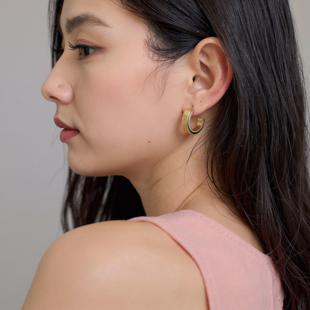 Details • Size : 0.8" X 0.8" X 0.2" • Post Back • Vibrant enamel hoop earrings designed with a multicolor finish for a playful yet refined touch. Lightweight and stylish, these hoops add a pop of personality to any look, making them the perfect accessory for both casual wear and statement outfits. • Brass • Gold Dipped • Hypoallergenic • Lead and Nickel Compliant • Made In Korea