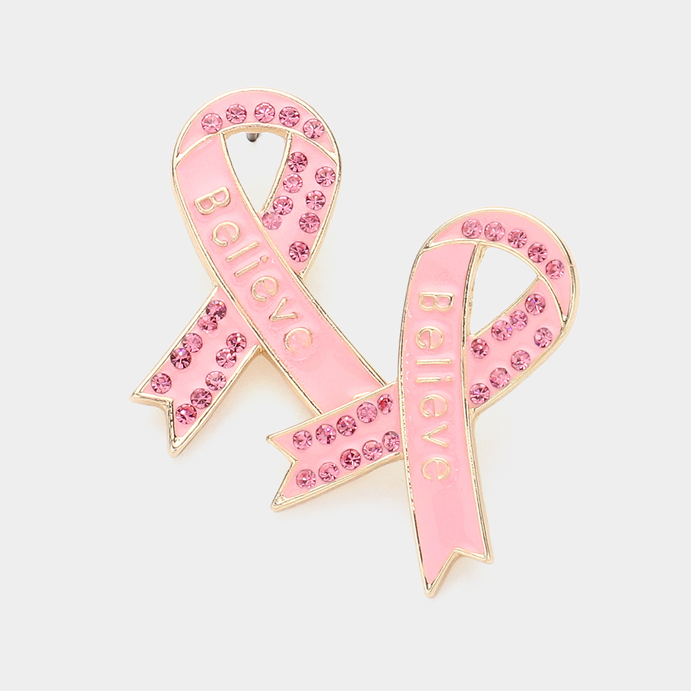 Believe Message Stone Paved Enamel Pink Ribbon Earrings