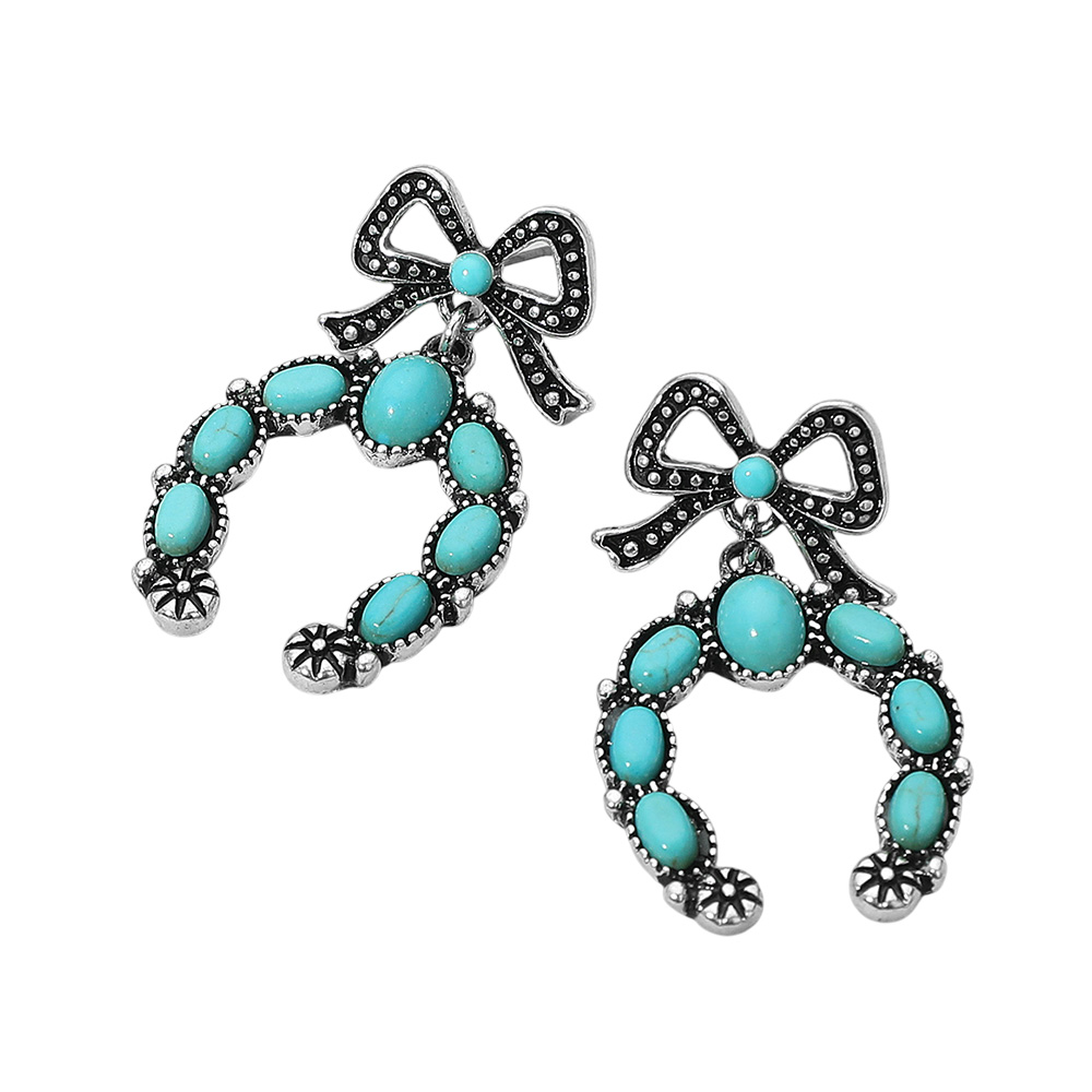 Details • Size : 1" X 1.75" • Post Back • Unique drop earrings featuring a bow accent paired with horseshoe-shaped pendants decorated with oval beads and intricate vintage-inspired detailing. A charming statement accessory for bold and playful style. • Lead and Nickel Compliant