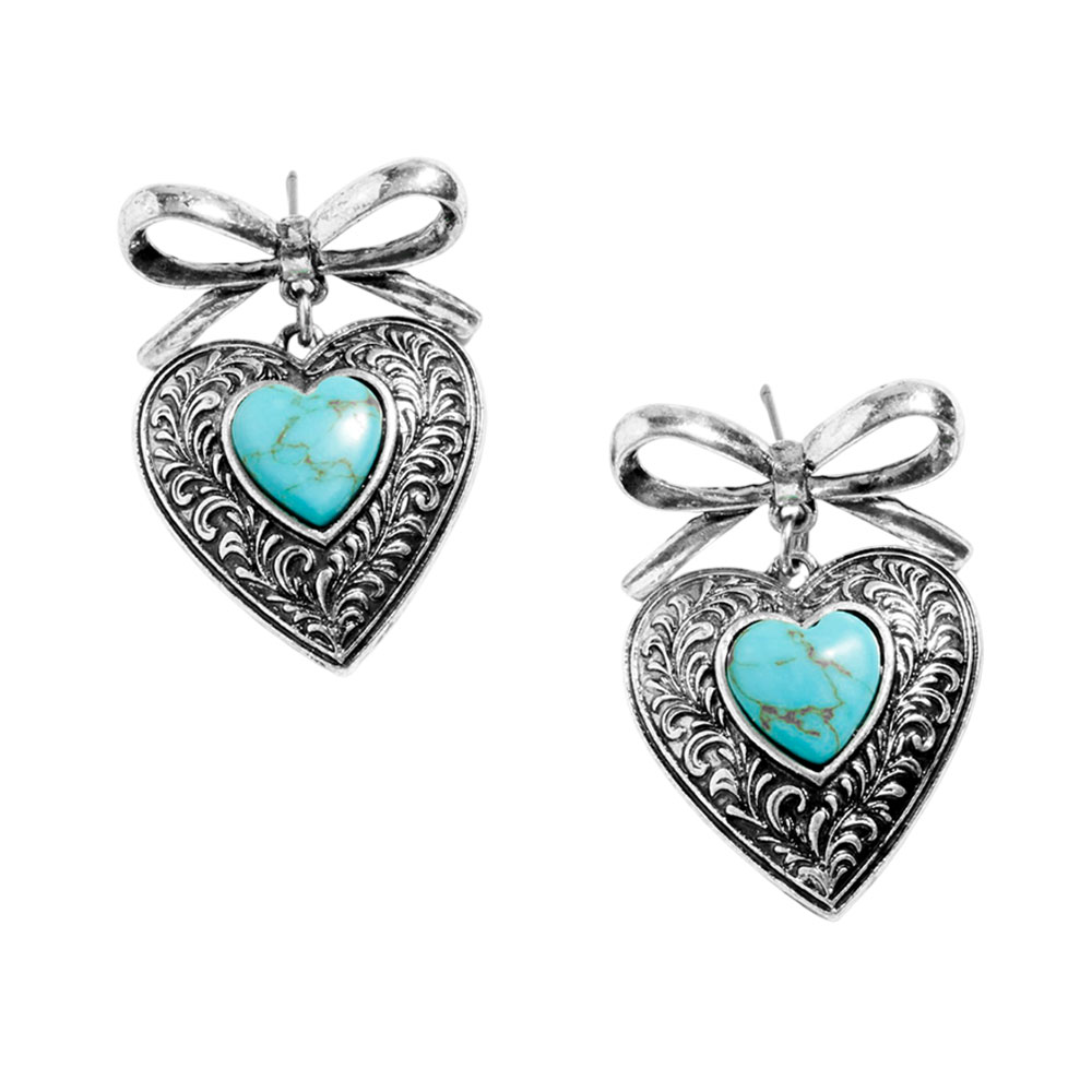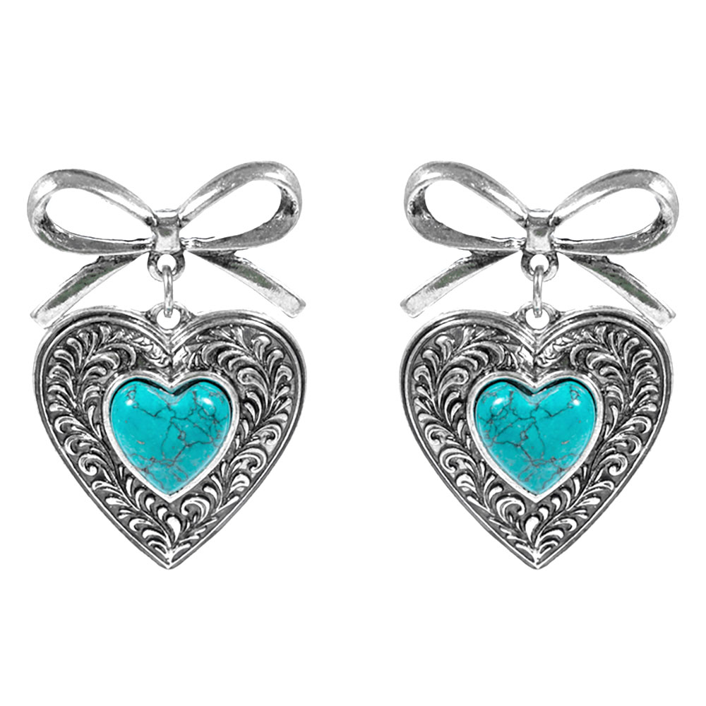 Details • Size : 1.25" X 2.8" • Titanium Post Back • Charming heart-shaped dangle earrings topped with a delicate bow design and detailed texture, created for playful everyday wear or special occasions, adding romantic flair to casual outfits, date nights, gifts, or statement accessory collections with timeless appeal. • Hypoallergenic • Lead and Nickel Compliant