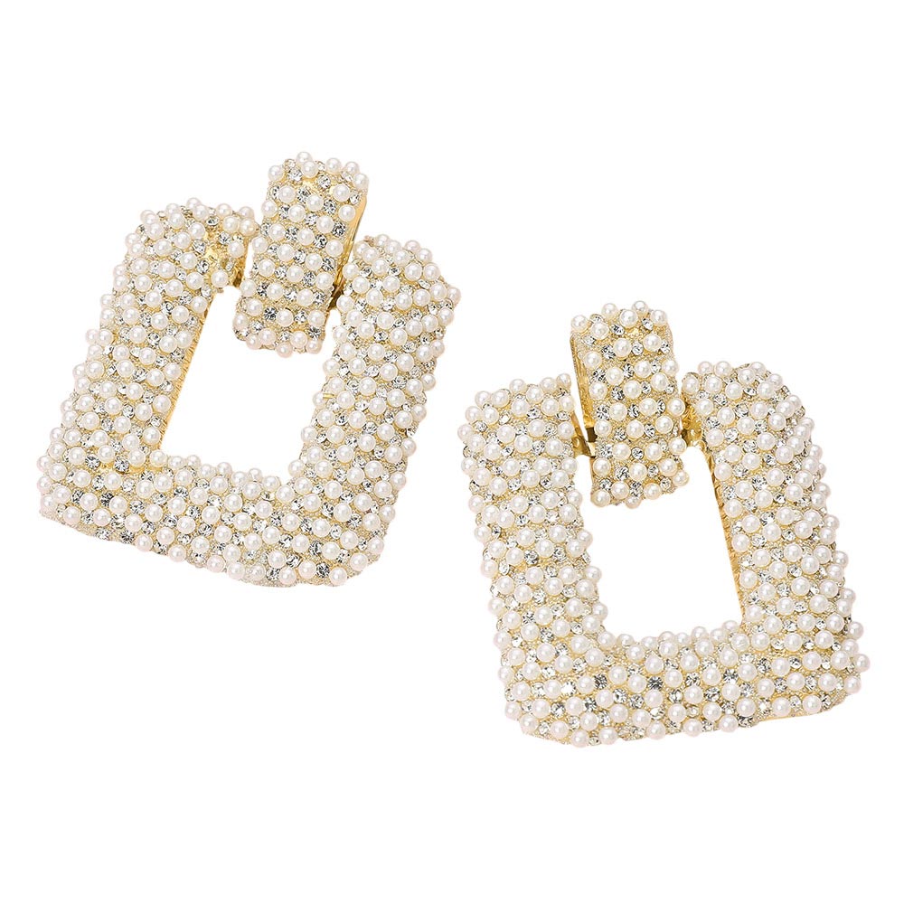 Details • Size : 1.18" X 2.3" • Post Back • These square pearl cluster statement earrings feature an intricate grid of shimmering accents for a look that’s both bold and elegant. Their sculpted design and rich texture create a refined balance of glamour and sophistication, perfect for special occasions or polished everyday wear. • Lead and Nickel Compliant