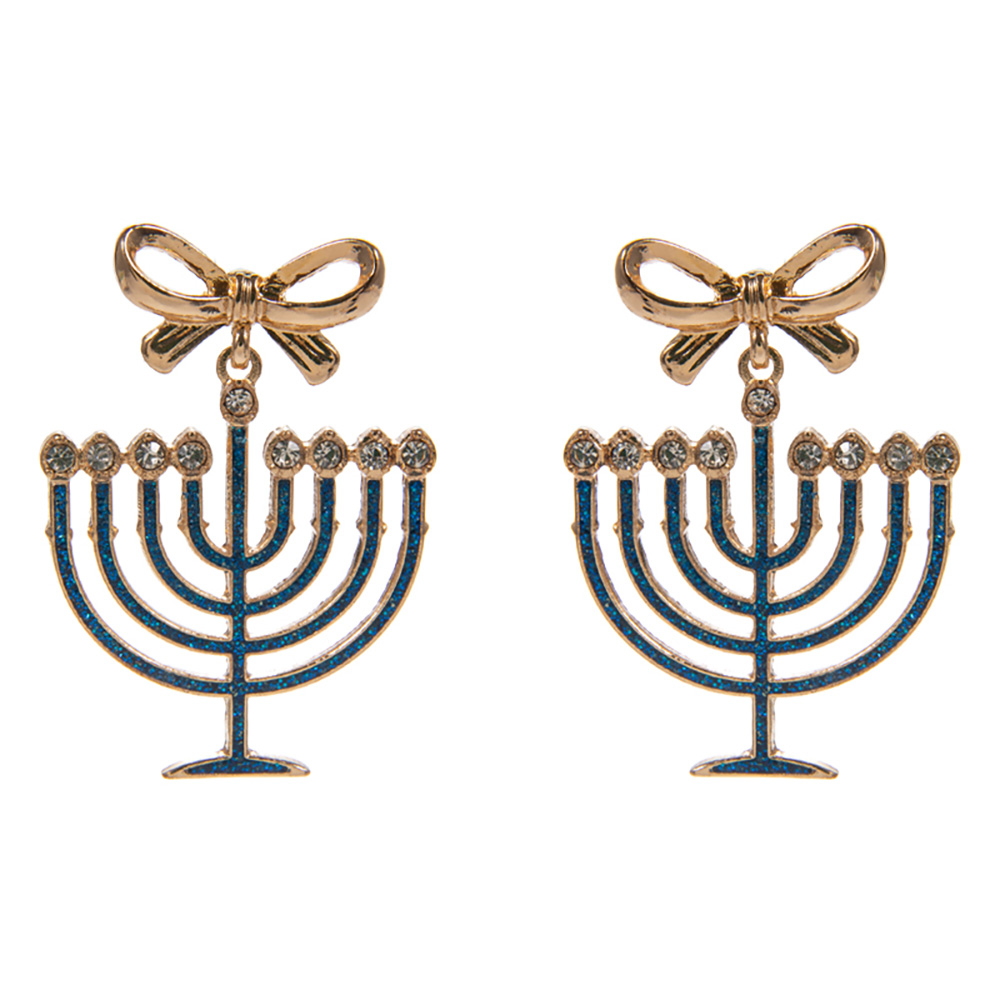 • Celebrate tradition with these menorah dangle earrings adorned with sparkling bow accents and detailed candle design. A meaningful accessory perfect for Hanukkah, holidays, or festive occasions, combining cultural symbolism with playful, elegant style.
